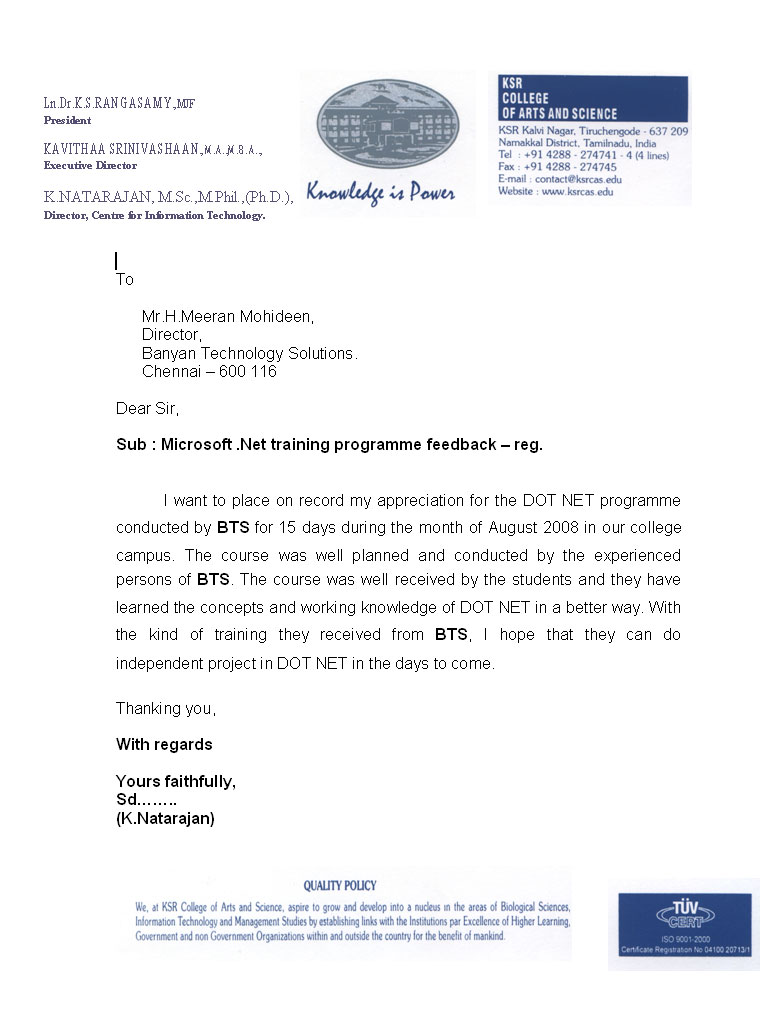 Dr.Natarajan also informed their students that it is better to learn the technologies like Microsoft .Net which has been widely used by many IT companies for their projects which will help the students to be technically equipped to get better placement in IT companies.He also thanked BTS for providing Hands on Training to their students which has helped them to gain a good knowledge on Microsoft .Net in short span of 15 days time.