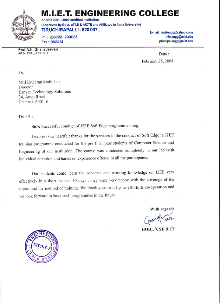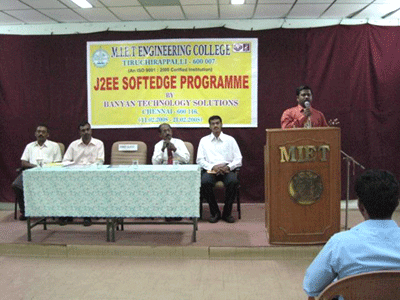MIET Engineering College, Trichy in association with Banyan Technology Solutions (BTS), Chennai hosted the J2EE Soft Edge program. Students from Pre-final year CSE department participated in this ten days Soft Edge programme. The launch of the program was featured in the regional dailies of Trichy with photos.