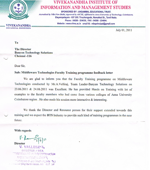Vivekananda Group of Educational Institutions, one of the well known institution having colleges in the field of Engineering & Management Studies organized Faculty training programme on Middleware Technologies during June 2011.